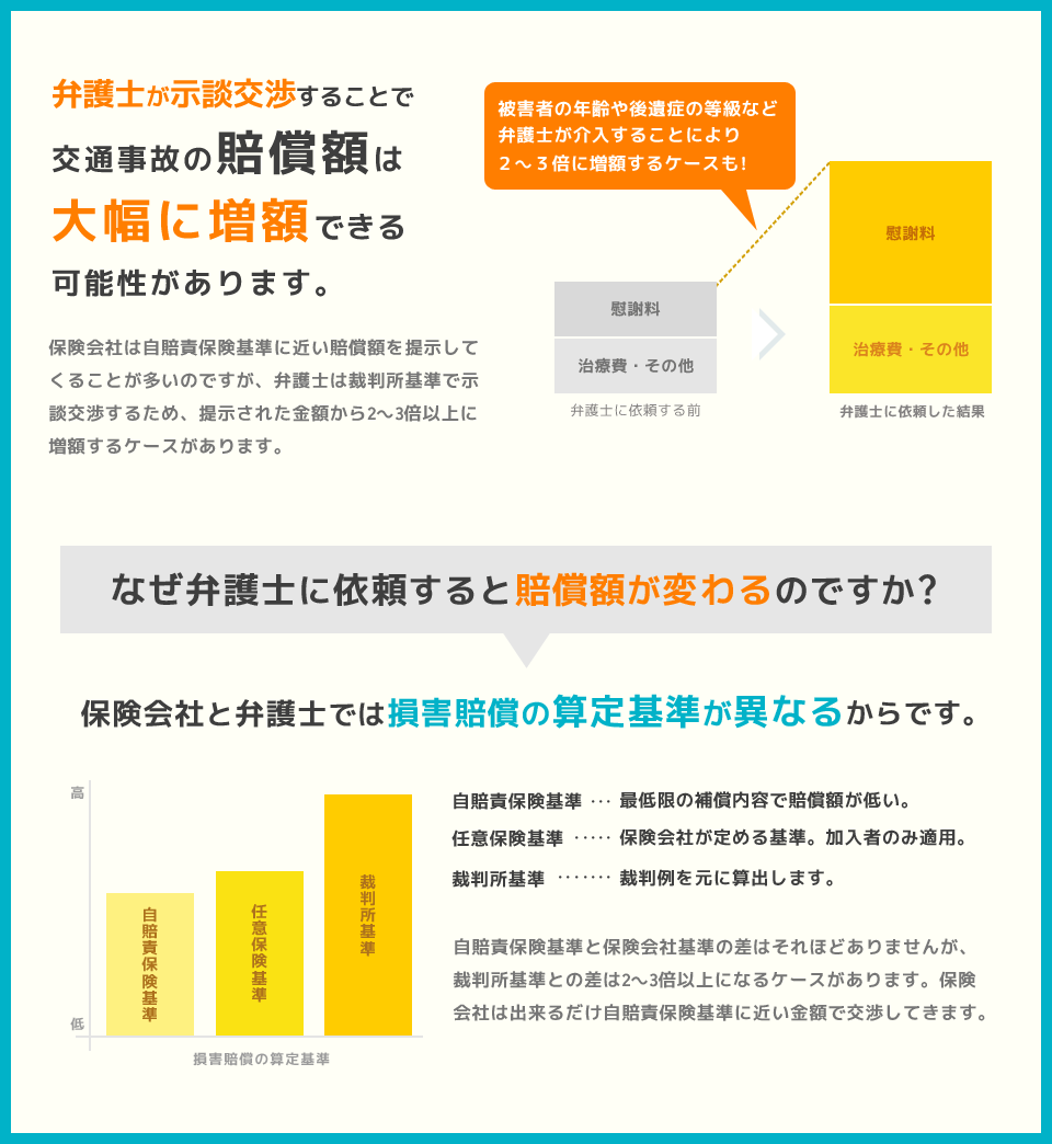 交通事故においては、保険会社はビジネスと捉え、損害賠償金の支払いについて「自賠責基準」や「任意保険基準」による低い金額を提示してきます。一定の期間が過ぎると、怪我の治療費を平然と打ち切ることもあります。