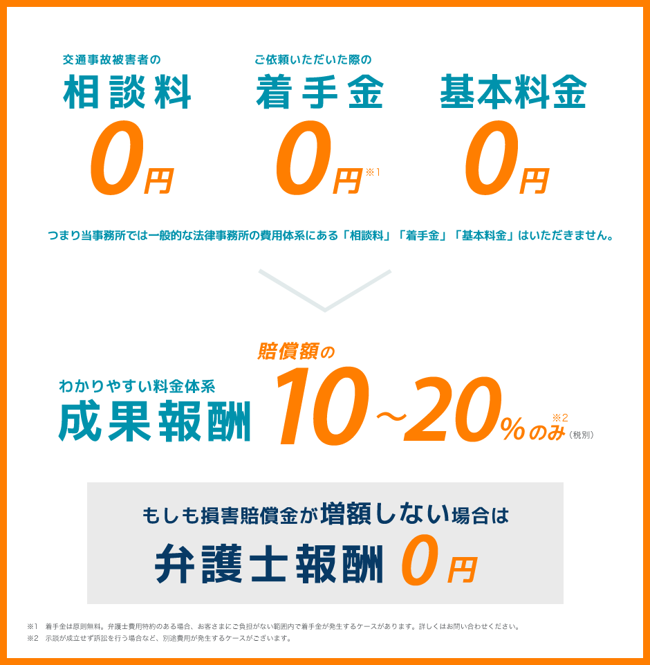 交通事故被害者のご相談はどんな事案でも無料です。また着手金・基本料金も無料です。